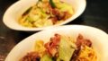 2. 肉味噌を作る。フライパンにサラダ油熱し、豚挽肉を香ばしく焼き、ほぐして長葱おろしニンニクおろし生姜を加えて炒め、調味料を加えて炒め合わせる。
